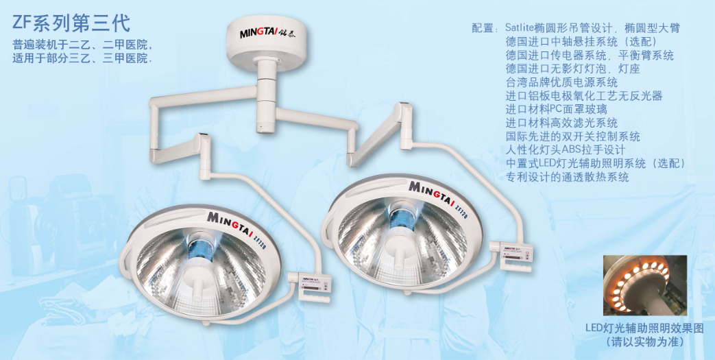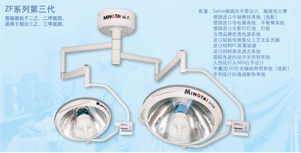 2 子母灯,双光源无影灯,多镜面整体反射结构。亮度:30000~165000LUX、20000~125000LUX